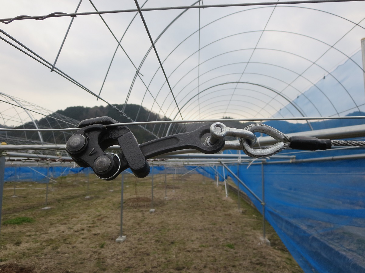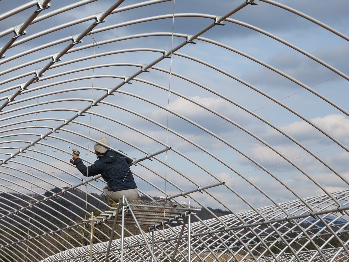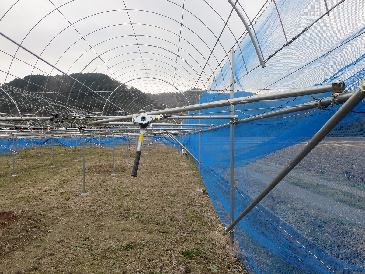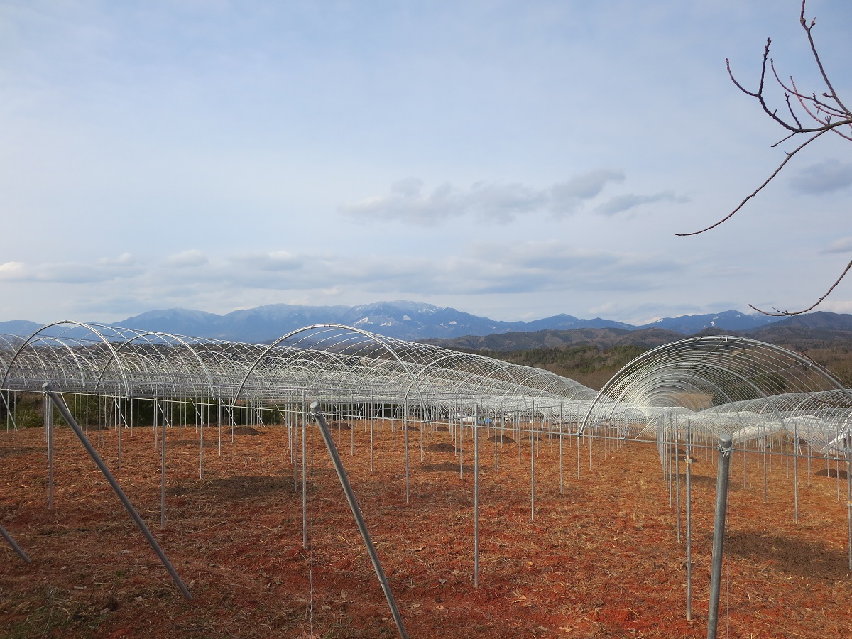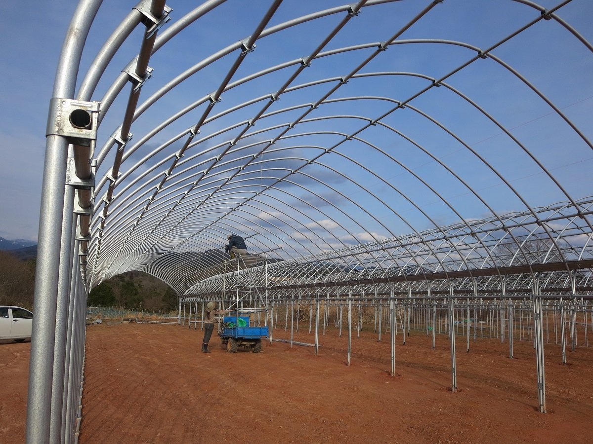耕作放棄地を整備して既に簡易被覆栽培のぶどう棚17aは完成し、今は15aのハウスの建設中でした。できるだけ初期投資を抑えるために、ハウスはラン栽培を止めた方から分けてもらい、自分達で分解運搬し、建設も2人でしておられましたが、初めてとは思えないような立派なできばえで驚かされました。