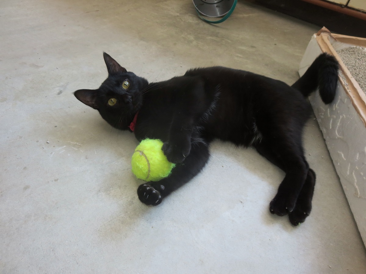 毎日ひとりで待っているクロちゃんが気になって、夜になって遊ぶ時間をとってみました。遊びの相手は一つ目、カマキリ。二つ目、テニスボール。