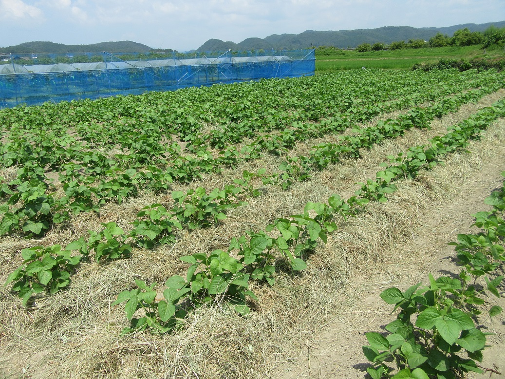 豆類は暑さには強いのですが、晴美ファームの黒大豆畑は砂地かかって水はけが良く昨年も一部の株が干害で葉が縮れ黄化しました。敷いた刈草は数日前に刈った第2ファームの畦の草です。刈草をくまざらで集め束にして紐で縛り、軽四で運んで黒大豆の株もとに葉にかからないように敷きました。何も日よけのない畑での作業で35℃位ある中で汗だくになって何とか敷き終えることができました。最近は黒大豆栽培者も高齢化し刈草を敷くような人はほとんどいなくなりましたが、成果がでれば良いのですが‥。