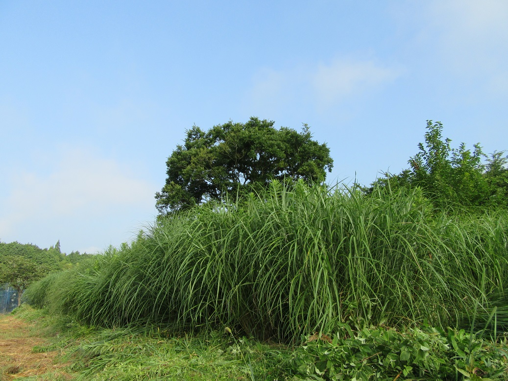 晴美ファームでは果樹の株もとに落ち葉を敷きその上に細断した茅を播いて土づくり、乾燥防止それに雑草対策をしていますが茅は農園の近くの遊休農地を借り株分けした茅を1m強の間隔で植えて茅畑として確保しています。しかし、茅以外の雑草が生えて環境が悪くなってしまいます。