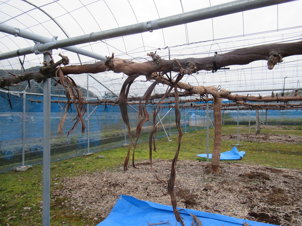 今日から3月。ぶどう幹(枝)の皮剥ぎの本格的スタートです。ぶどうの幹は樹が年数を経ると古い皮が幹から剥がれ浮いてきます。そこに害虫が卵を産み樹に被害を起こすことがあるので古い皮はない方が良いのでそれを剥ぎ取ります。剥ぎ取りは幹と古皮の間に専用の金具を差し込んで皮を浮かせ手で引っ張って取ります。皮を剥ぎ取ると新しい皮が出て来ますが極端な寒さに遭うと凍害を受けることがあるので晴美ファームでは3月になってからします。幹(枝)は鉄線にヒモで固定しているので皮を剥ぐためにはそれを外し、皮剥後に再度固定しなくてはならず結構時間がかかります。皮剥ぎが終わったぶどうはスッキリ綺麗になり芽吹きを待ちます。
