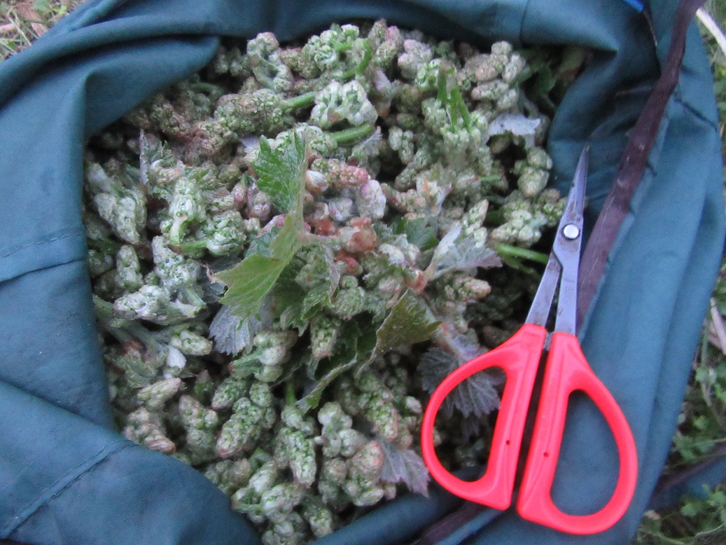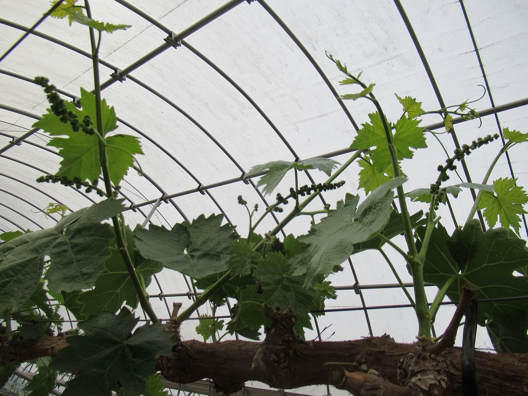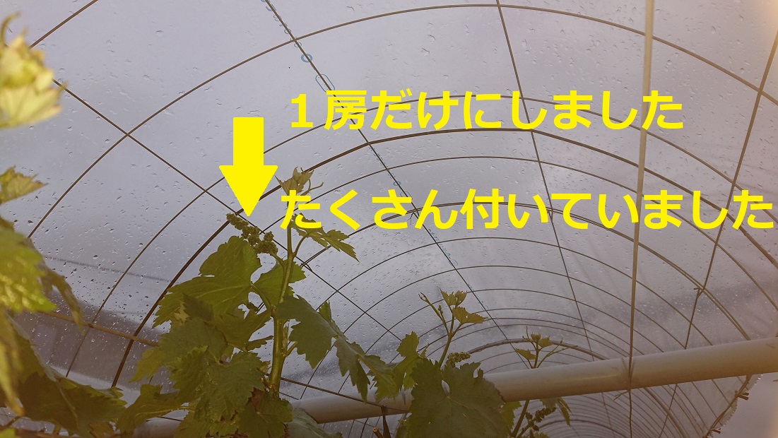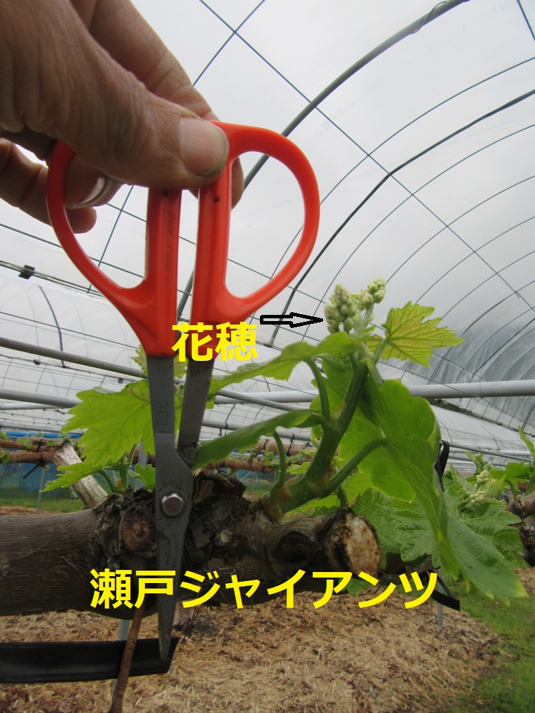 今日はピオーネの花穂(房になる花)の切り取りをしました。ピオーネは他の品種に比べ花穂のつきが良く(特に晴美ファームでは良く過ぎ)て、永く残しておくと穂先の生育が悪くなってしまいます。また、第1花穂までの節間が短く枝の誘引をするための捻枝が難しです。そこで晴美ファームでは最初につく第1花穂は早めに切り取り第2花穂を整形して房にしています。早く花穂を着ればその後の生育が良くなるので出来ればまだ伸びていない枝から切って生育を進めれればいいのですが、残しておくと花穂に力を取られてしまうので第1花穂が判別出来れば切っています。