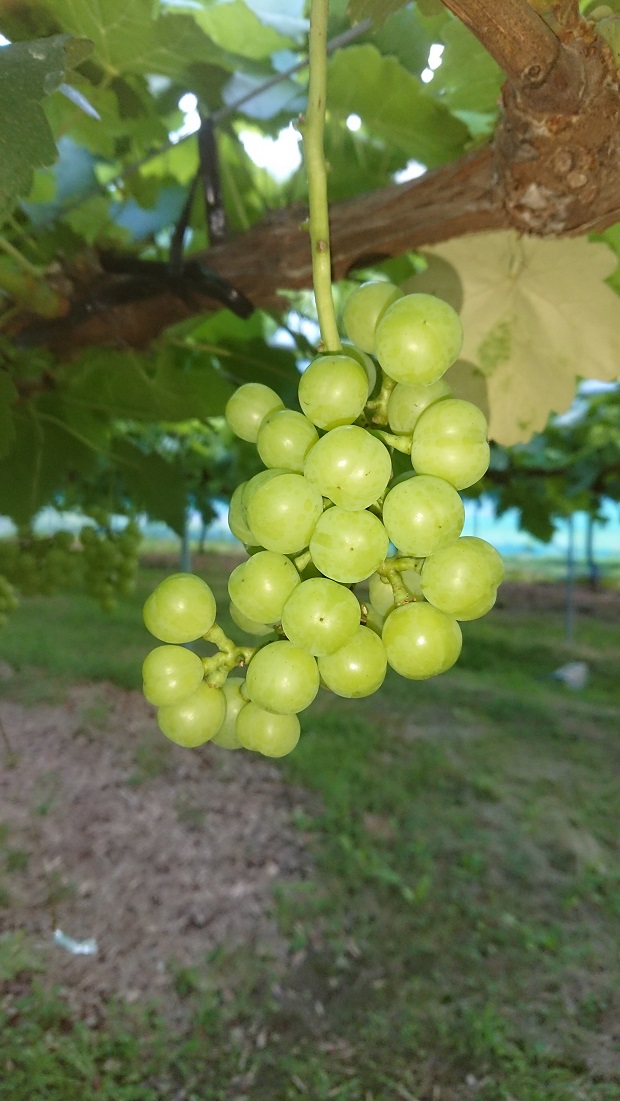 栽培資料では、簡易被覆栽培で1粒14g程度で650g程度の房を目標にすると書いてあります。しかし昨年、晴美ファームでは650~700gの房づくりをして糖度が上がらず収穫に苦労したため今年は550~600gの小房にしてみることにしました。小房にすると粒太りが良くなるのではとかんがえたのですが昨年どの程度間引いたのか思い出せません。1粒15gを狙っているので、現在3~6gの大きさなので直径は約1.4倍になると考えて粒の間を空けなければいけないことになりますが間引きの程度は房ごとにバラバラになってしまいました。果たして結果はどうなるか?9月が楽しみであり不安でもあります。