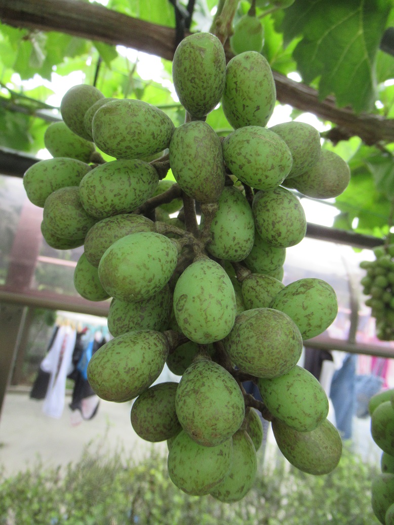 今日、岡山に出る用事があったので、県の農業試験場に寄ってきました。我が家のブドウ作りの反省をするよい機会になりました。ピオーネ、シャインマスカットなどまだ房が大きかったです。それに反して瀬戸ジャイアンツは小さかったなという感じです。さらにシャインマスカットですが、我が家はもう袋を掛けてしまいましたが、もっと最後まで諦めず玉ころがしをしなければならなかったようです。もう出来ん!という頃まではさみを入れ、よい房作りをするそうです。また色がつかないと商品にならないブドウは(ピオーネなど)葉の枝切りをせずに、葉を垂らしておくそうです。それは切ることによって、養分が実にいき、粒が太ると色がつかないそうです。いろいろ勉強です。試験場のシャインマスカットです。比較物がありませんが、とても大粒になっています。」