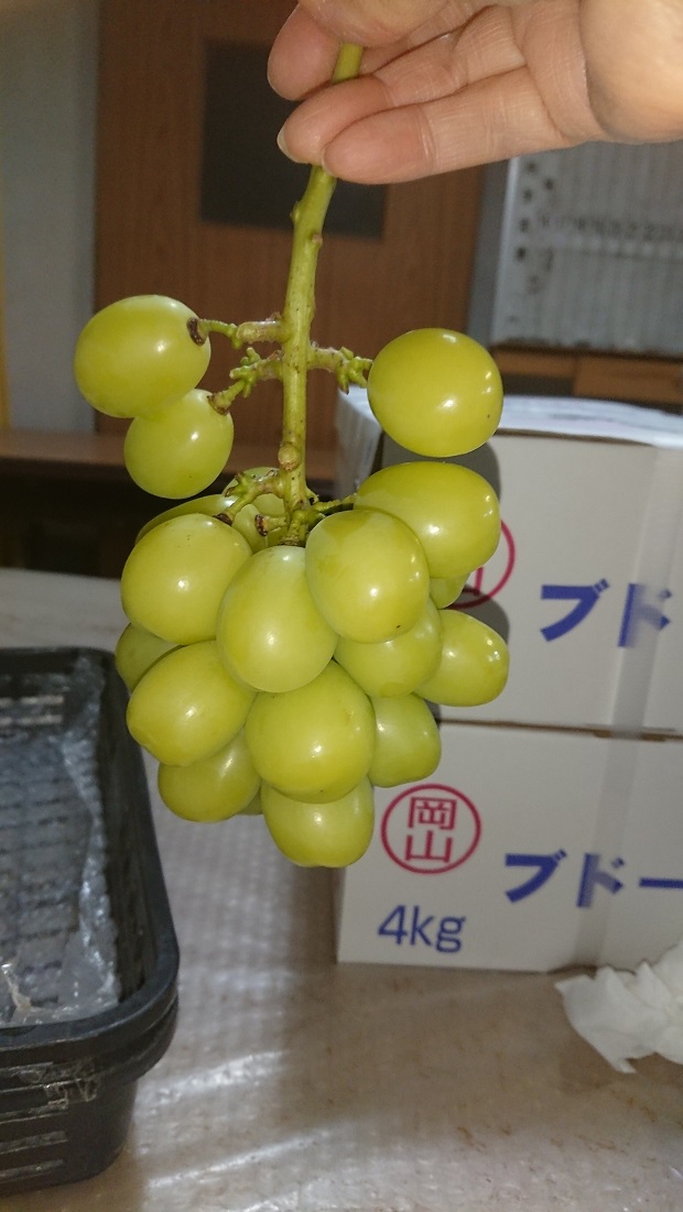 いやはや、ここ数日は家庭用シャインマスカットの粒切りをしています。実は5本あるシャインマスカットの成木のうち1本に今年はすっぱい房ができてしまいました。それは、ハウスの中の木です。露地の木はとても甘いそうです。まず、いけない木は房に縮果(しわがいったもの)がでています。隣の木のサニードルチェも縮果が多く出ました。どういうことか悩んでいます。とうとう、一昨日、普及センターに聞いてみたら、土を調べてみようということになりました。今日もハウスのシャインマスカットを5,6房採ってきて、酸っぱそうな粒をはさみで切って取りました。「これは、酸っぱそうだ。」と食べてみる。「もう、そろそろ、甘いかな。」と切って食べてみる。そうこうしていると蒲萄でお腹がいっぱいになりました。残った粒はたぶん甘いと思いますが、ぬけぬけのちいさな房になってしまいました。これが、良い蒲萄だったら、まだまだ箱が作れるのですが。