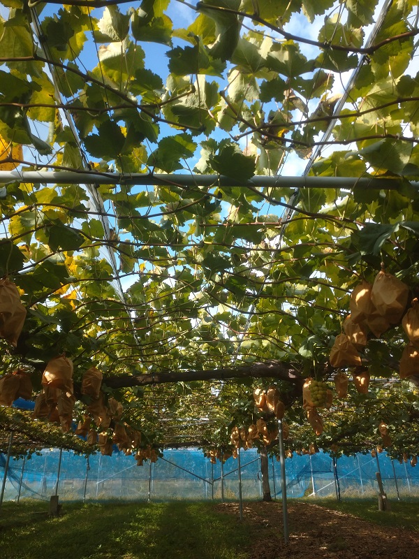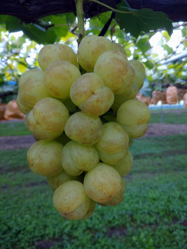 今年の青系ぶどうは例年とは違う状況にあります。夏場の長雨ののせいかシャインマスカットは、房の中に小粒で緑色抜けしない粒を含んだり糖度の上がりが遅かったり影響が出ています。また、瀬戸ジャイアンツは平年より糖度の上がりは良いのですが果皮にかすり状の汚れが激しく出ています。折角甘くてジューシーな瀬戸が育ったのに外観が悪ければ商品価値は下がってしまいます。黒大豆の若莢にも似たような汚れができますが黒大豆はウイルスによるもで瀬戸は生理障害が原因だそうです。晴美ファームでも掛け袋の色を変えたり、カルシウムやケイ酸を施用したりいろいろ研究してきましたが解決策はまだ見つかっていません。どなたか瀬戸のかすり症状を抑えられる方法を知っておられたらご教示願います。