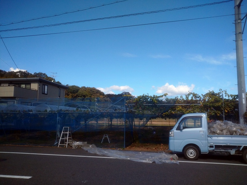 今日でぶどう被覆の農ポリの取り外しを終わりました。 午前中は夜露で農ポリ全体が濡れていたり、午後は強風を含んで巻き取りがし難くかったりで数日かかってしまいました。それでも農ポリを外したことでこれから紅葉と落葉が進み次の土づくり作業に早く移れるようになります。(本来なら農ポリ外しはもっと早く済ませておけば良いのですが収穫出荷作業が忙しくで出来ませんでした)〈今日は夕方他の作業をして忙しく写真を撮れませんでした。写真は明日改めて載せます〉