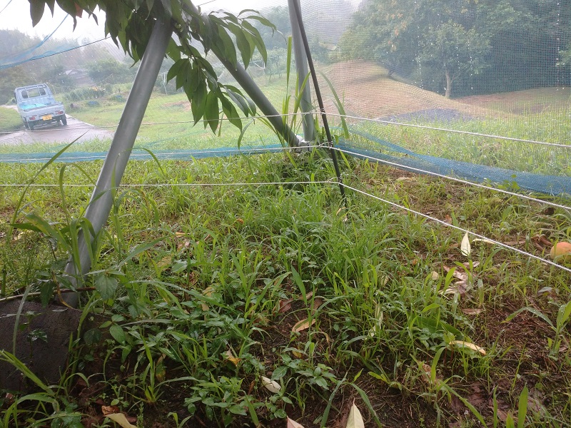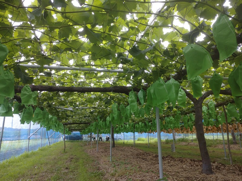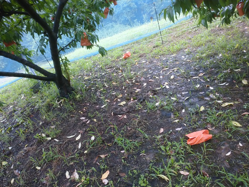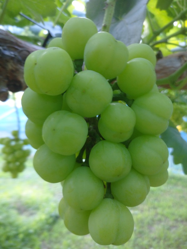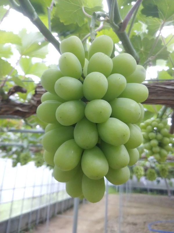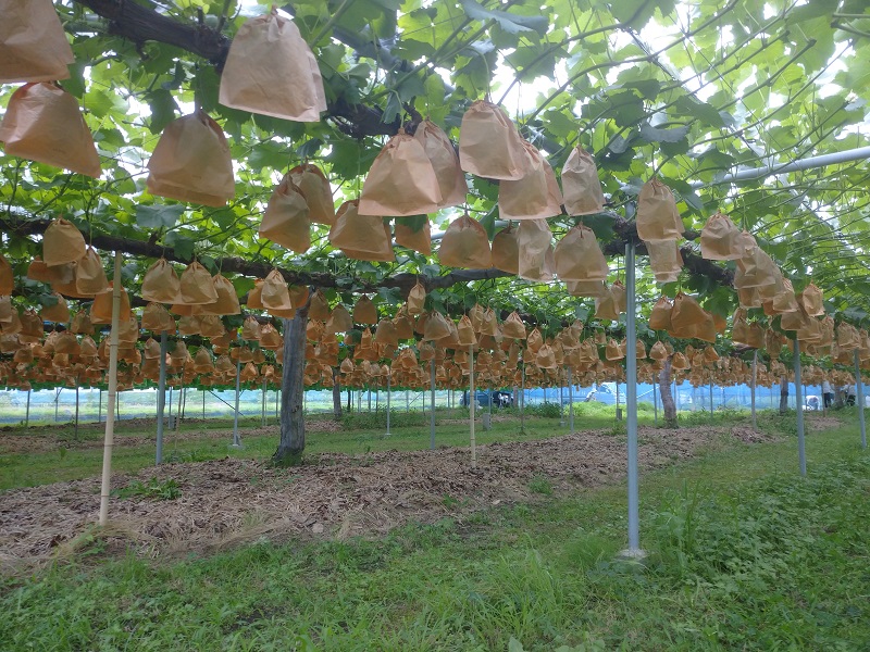シャインマスカットと瀬戸ジャイアンツの袋掛けをしました。3日前にはまだ瀬戸ジャイアンツの仕上げ間引きはまだほとんどできていませんでした。シャインマスカットも何度も粒間引きをしていましたが、まだ大きくなるかな、と袋掛けに入ろうとは思っていませんでした。しかし、天気予報を見ると、週末は大雨。これはいけん、と思って、応急防除の薬の名前を検索し買いに行き、次の日はバイトさんと全員で瀬戸ジャイアンツの仕上げ間引きを本気でやり、そして今日は朝5時から残っている粒間引きに取り掛かり、8時からは平行して、防除もし、1時間ほど乾かして、11時から袋掛けに突入しました。お昼を早くに食べて、バイトさんたちも次々来てくれて、連続でやすみなく5時間をかけて袋掛けを完了しました。雨の前にできたのは奇跡のようです。
