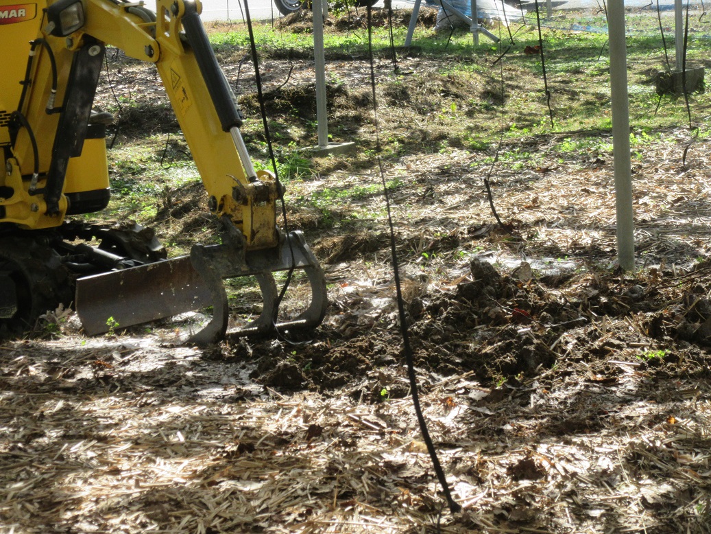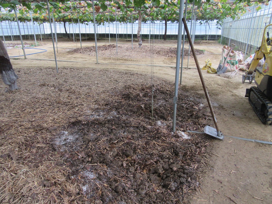 今日は第1ファームのトンネル被覆栽培ぶどう園の土づくりをしました。ミニユンボのバケットを特注の3本爪のフォークに変え作業開始です。フォークを使うのはバケットだとぶどうの根をほとんど掘り起こして切ってしまうからです。掘る場所は毎年ぶどうの幹を中心にして掘る方向を変えて行っており、幹から3m程離れた場所を1本につき2方向を掘っています。場所が決まるとその場所に幹の周辺に敷いていた古くなった落ち葉と細断茅を集め、さらに土壌改良用のネニサンソをスコップで適当にまき、フォークを差し込み揺らすようにして土を割れ目をつくり落ち葉などが土と混ざるようにしていきます。ぶどうの根を幾らかは切ってしまいますが新しい根がすぐに広がるのでOKです。