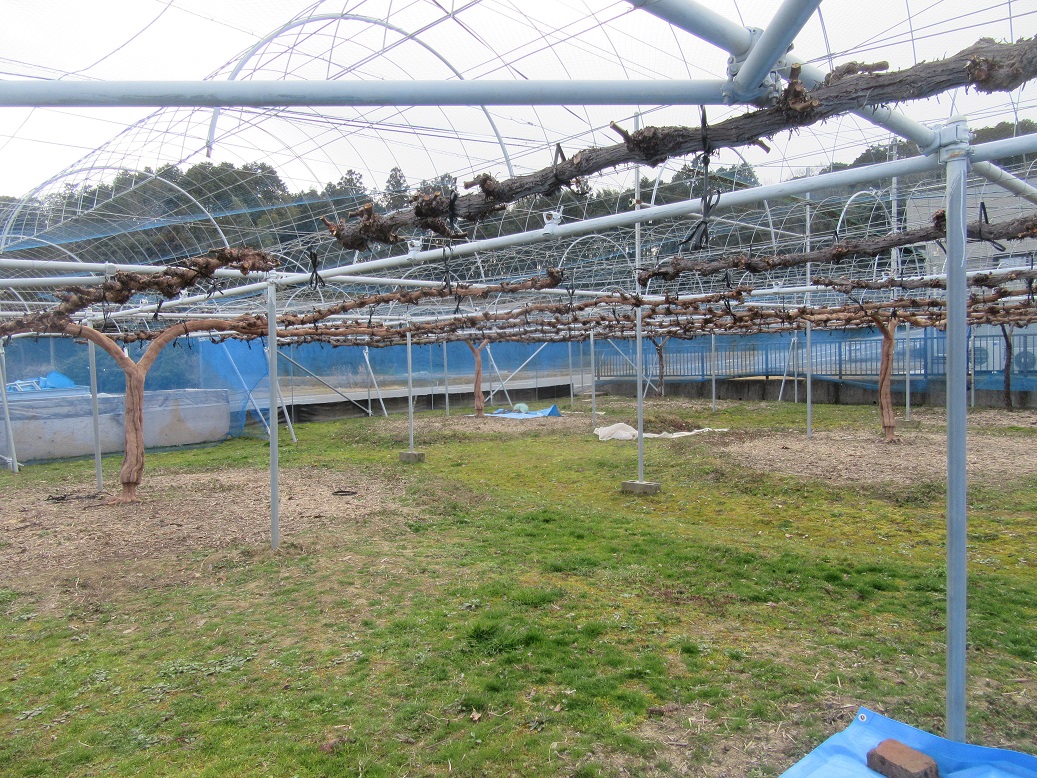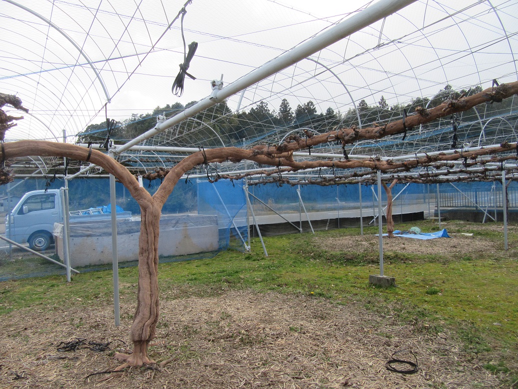 今朝、農園を回るとハウスの中のものと露地に植えてあるもののクイーンニーナだけから、ポタポタとしずくが落ちていました。水が回るといいます。しかししかし、明日の朝は心配していた超低温が襲う予定です。ポタポタ落ちている水が凍ったら、絶対に良い影響はないと思われます。シャインマスカットは水が回ってないのですが、クイーンニーナはどうしたことでしょう。露地の1本は一昨日剪定したばかりです。剪定を待ちすぎて遅かったのでしょうか。困った、困ったと言っていたら、パートナーがそれならば防寒をしよう、と言って、勝手にパオパオを持って来て、新しい切り口だけを包みました。こんなことをしてもどうにもならんじゃろう!!という感じです。
