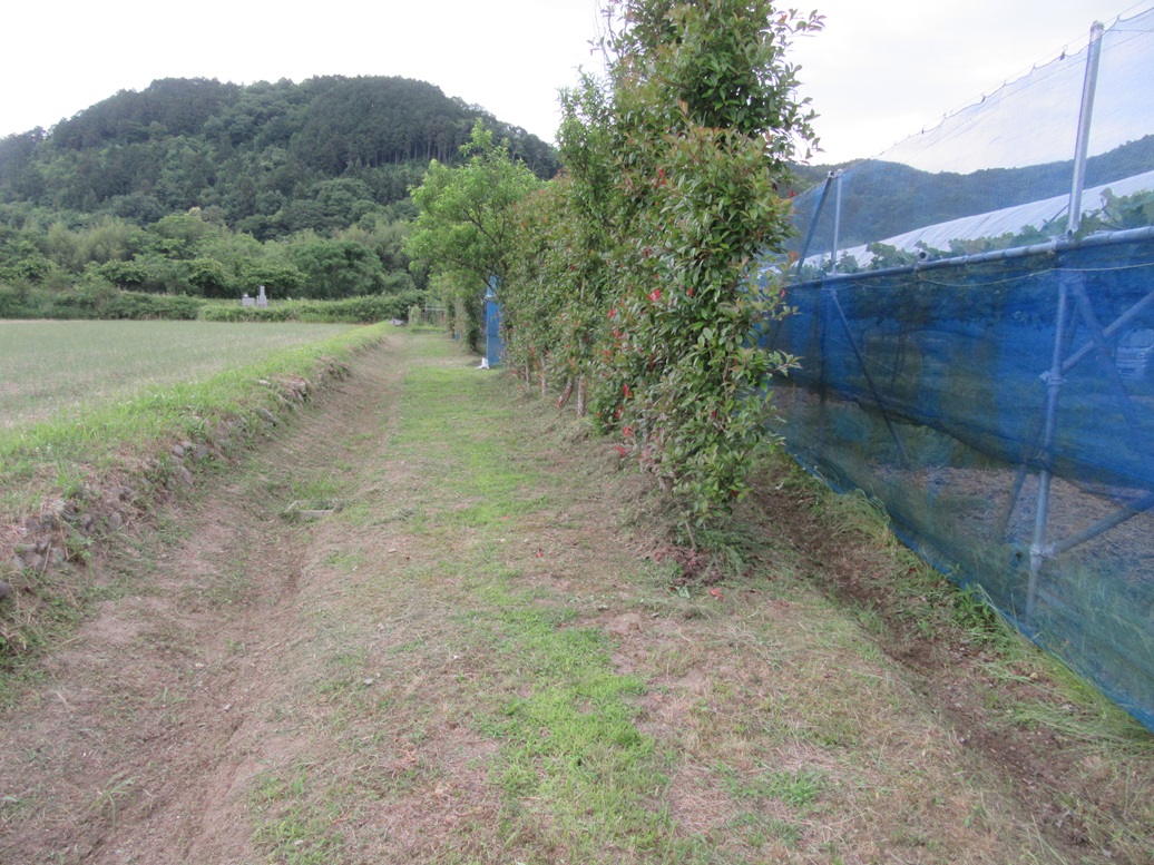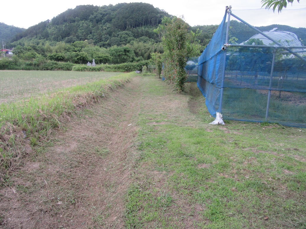 豊国原地区では6月9日(日)から田植えが始まるので1週間前の明日2日から水路に用水が流れはじめます。田に水が入ると困るのが溢れ出る水が多量にぶどう園に入ることです。特に晴美ファームのぶどう園は水田に囲まれ一方は高い位置になるので水の侵入が心配です。一応は畔下に排水路を設けるとともにぶどう園を畔下排水路から3m離して二重に排水路を作っているので大丈夫だと思うのですが畔にもぐらが穴を開けることがあるので準備をしなければいけません。そこで今日はぶどうの管理が忙しいのですが午後から半日ぶどう園の周りの草刈りをしました。畔を綺麗に刈っておけば上の田から水が漏れてきても位置確認がすぐでき水を止めることができます。
