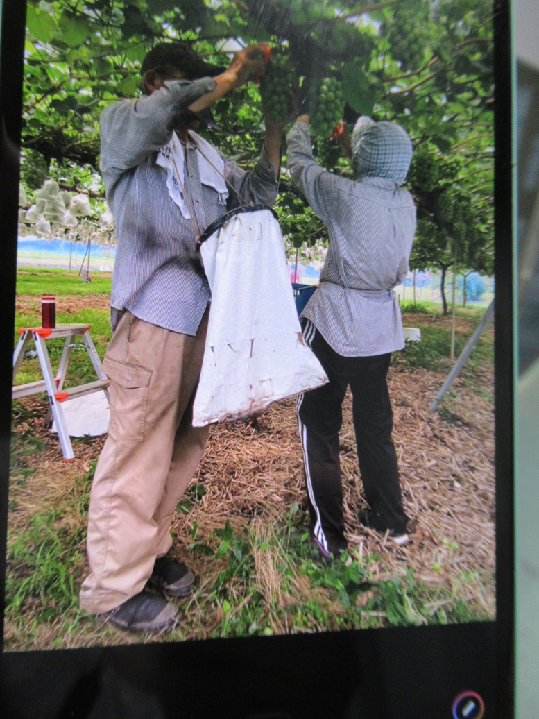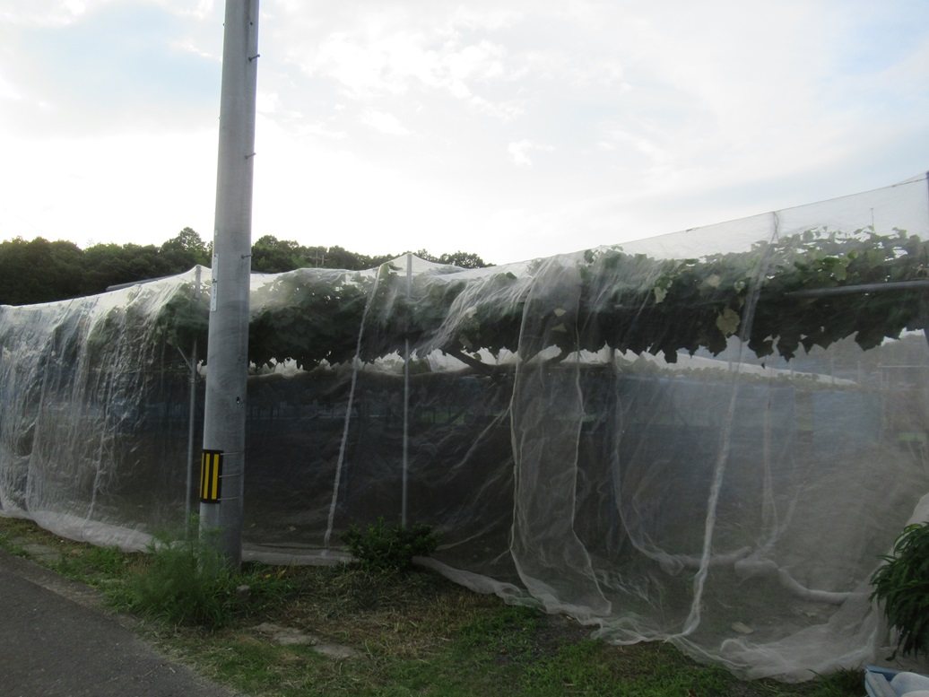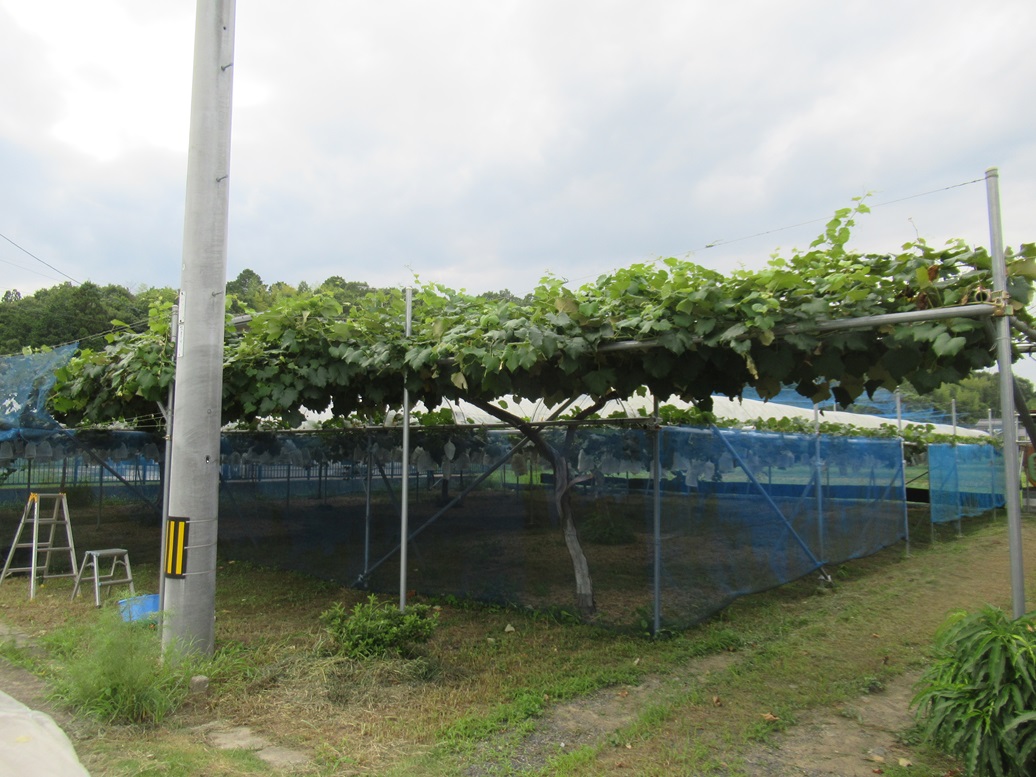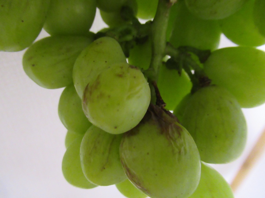 晴美ファームの栽培しているぶどうの中で手間のかかるぶどうといえばコトピーとロザリオヴィアンコと言えます。コトピーは粒に生理障害が発生しやすくべと病にも弱いです。また、着色が良くありません。ロザリオは結果枝の発生が不揃いで花穂の花の着きが良すぎて房づくりが難しいです。今後、この2品種を続けていくか否かがファームの課題です。ロザリオについて言えば更に問題が出ました。今日、ぶどうを見て回っていると粒に汚れと皺化している房を幾つか見つけました。10年以上栽培してきたロザリオですが初めてのことで病気なのか害虫によるものか又は生理障害なのかわかりません。一応防除はしましたがこれ以上広がらないのを願うばかりです。