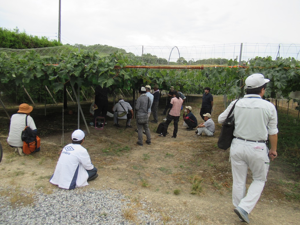 昨日ハウスシャインにハダニが見つかったので、朝から露地の方に行って、どうかなと見回りをしていました。最初は見つからず、大丈夫かと思ったのですが、家に葉を持ち帰って、10倍のルーペでかなり根気よく見ていると、いるわ、いるわ。案外、黄色の葉ではなく、まだ緑色の葉にいました。パートナーにも見せると、30分ぐらいしてようやく、「これっ?」と言うので、やっとダニについては学習完了となりました。それから、葉が続けて落ちているシャインマスカットの幼木ですが、よく見ると、これまた、いるわ、いるわ、なのです。水不足で葉が落ちている、と思っていたのですが、そうすると、露地のクイーンニーナの幼木もダニの影響なのでしょうか。見てみた結果はダニはクイーンニーナにはいなかったという結果です。農協に行って、調べてもらって、薬を買ってきたので、明日は朝から防除に取り組みます。