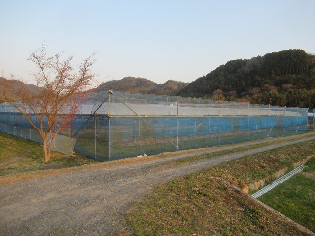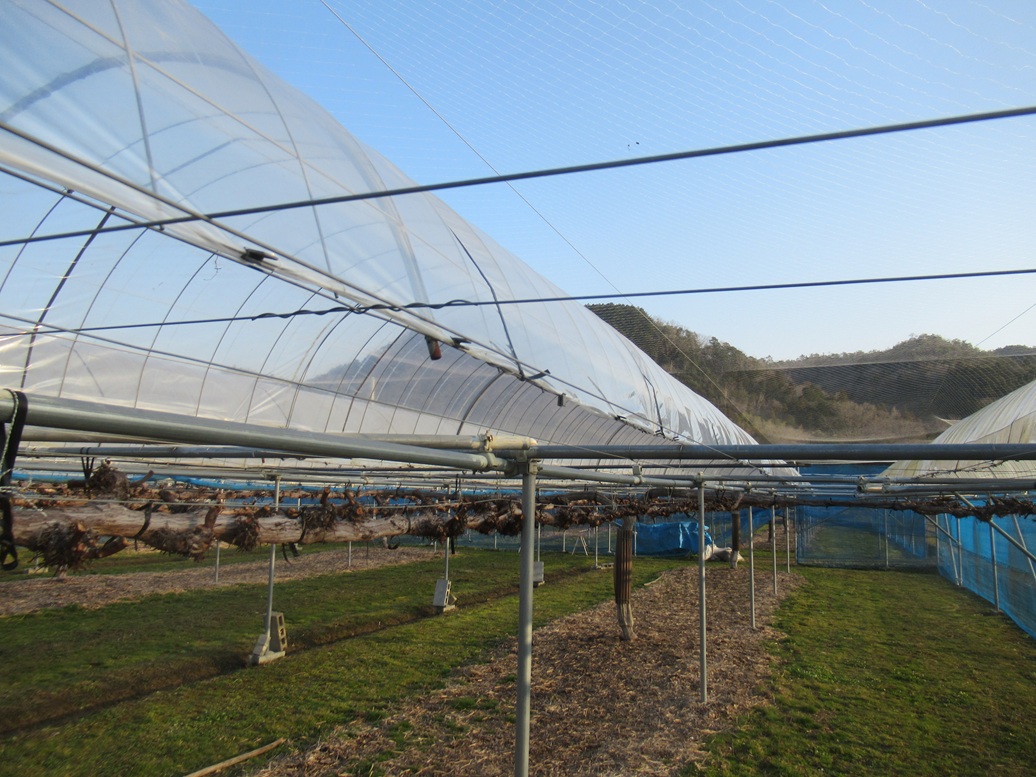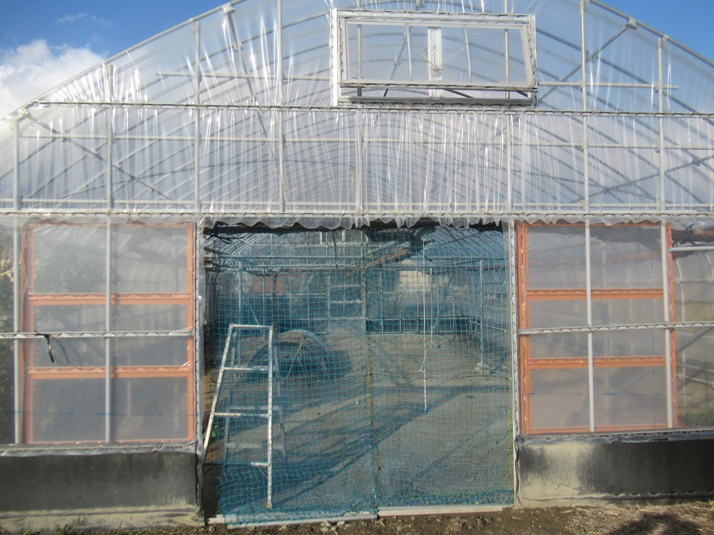 さて、今日は新ハウスの中にトンネルを設置しました。何回か既にお知らせしたように晴美ファームでは新ハウスに1年間は農ポリを張りません。代わりに新梢が雨に会わないようにその部分だけにトンネルを設置します。トンネルは誘引鉄線に縦置きに載せるように固定して設置するので強風で大きく揺れないように何か所も固定しなければいけないので手間がかかり大変でした。
