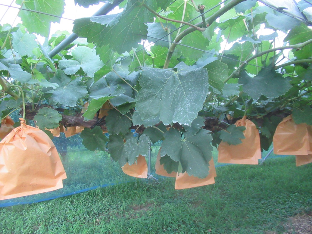 今日は露地ぶどうの今年最後の袋掛けでした。最初にピオーネやオーロラブラックを、次にシャインマスカットをそして、今日は瀬戸ジャイアンツを仕上げて袋掛けとなりました。なるべく、粒間引きをして、大きくしてやりたいと思うぶどうたちですが、果たして、どのくらい大きくなるものなのか予想しきれないところです。また袋を開けて様子を見ることも見ることもできるでしょう。手抜きしないようにこれからも頑張ります。