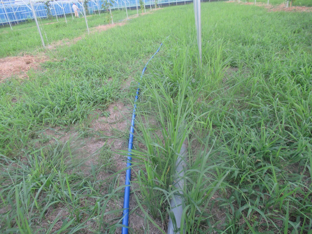順調に伸びていた新ハウスのマスカサーテインですが、昨日の朝見回りをしていると、根本の方の大きい葉が縮んで黒っぽくなって、ひらっと落ちているのもあったりして、びっくりしました。これは水が足りてないのかもしれないと思ったものの、雨は時々いい間隔で降っているしなあ、と土を触ると乾燥していました。トンネルで、雨を防いでいるせいか、幼木は根が広がっていないので、水が届いていなかったのかもしれないと思いました。急いで、朝から用水をせき止めて(農業用水は中干で止まっているので)ポンプを接続して水やりをしました。あと1か月しか、芽は伸ばしてやれないので、(先端を切って止めるので、)今年、どこまで枝ができるかどうかにかかっています。大事なマスカサーテインです。