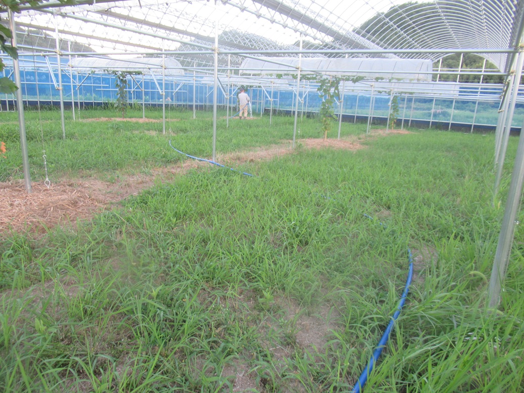 草刈りは午前中しかできず、ピオーネの脇芽切りやロザリオヴィアンコの粒間引きなどを並行してやっています。暑いのはたいへん暑いですが、時々よい風がふくので、なんとか外の仕事が出来ています。ロザリオヴィアンコは硬核期が続いていたので、粒間引きをせずにいたら、小粒のぶどうが多量に付いてカッチカチになっている房がしばしば有りました。非常に粒を切るのがたいへんです。まだ継続中です。今年は、例年のように大房ロザリオではなく、大粒で小房のロザリオを目指したのですが、よく見るとぜんぜん、目標達成は出来てないようです。今年も大房になりそうです。粒間引きも難しく大変です。