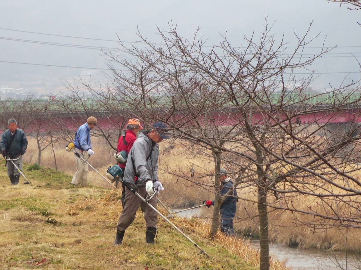 豊国原の東を流れる梶並川の堤防両側約1kmにわたって河津桜が200本以上植えてあります。中国自動車道で大阪方面から来ると美作ICの少し前から左手に桜並木がよく見えます。 元々は市の音頭で春先に帰省する人や観光客を気持ち良く迎えるために植えたものですが管理は隣接する集落が区分けをして管理しています。 豊国原では「豊国原五十嵐会」というボランティア団体を組織し年数回草刈りや防除等の管理をしていますが、今日は、開花前の管理と言うことで約30人が参加し草刈り作業を行いました。3月中旬には濃いピンクの花を楽しめます。 今はまだ小さな木ですが数年後には美作の名所になるよう皆で頑張ります。