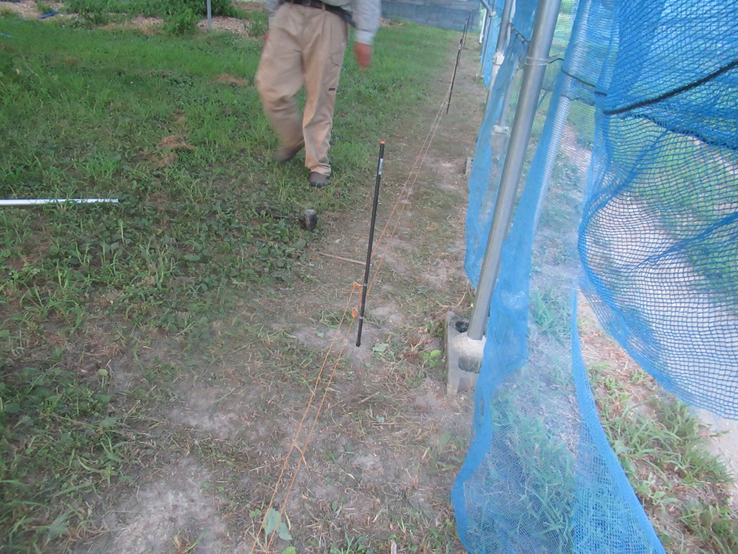 晴美ファームの第3ファームはいつも何者かの小さな獣にピオーネを食べられます。今年は今日が最初でした。ピオーネの植えてあるところの真ん中あたりに白い袋がひらり。朝6時ごろにびっくり。よく見ると、だいぶ紫色になってきた大粒のピオーネが3つか4つ食べられていました。そして、ぶどうのふくろは大きく縦にさけるように破られており、大胆な手口です。なんとかやってきた獣をビリッとさせなければいけません。ということで今日は日暮れまでに電柵を設置しました。草が電柵に届くと電流がながれないようになってしまうので、地面の草を刈ってから、電柵を張りました。なかなか手間がいりました。IMG_7747IMG_7748