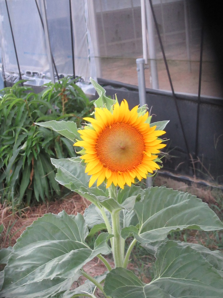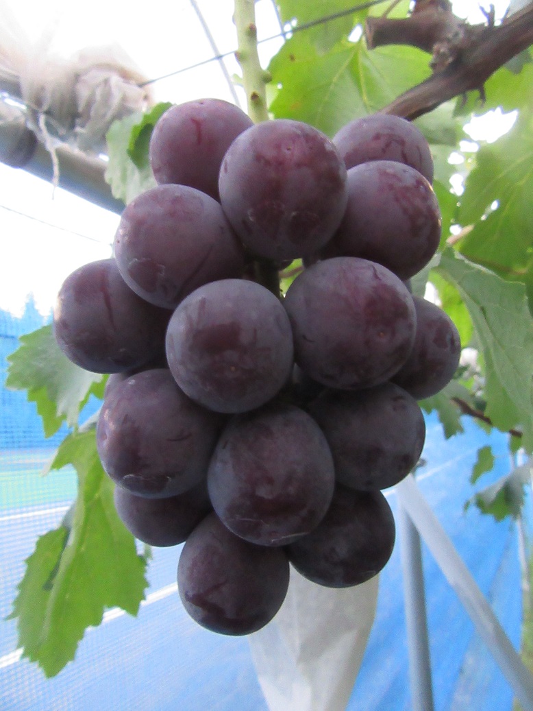 ようやくヒマワリの開花です。ハウスの横に植えているひまわりですが最近の異常な高温と小雨で生育が遅れ今日8月になってようやく開花し始めました。先日の台風12号で雨は降りましたが、まだまだ不足のようで今後も晴れの日が続くとヒマワリにも潅水をしなければいけません。 そんな異常な今年の夏ですが、ピオーネはだんだんと黒く色づいてきました。できれば夜温がもう少し下がってくれれば着色が進むのですがどこまで色がつくのか心配です。ことしは、房の大きさを小さくし、房数も減らしたので昨年よりは黒く色づいてくれと願っています。