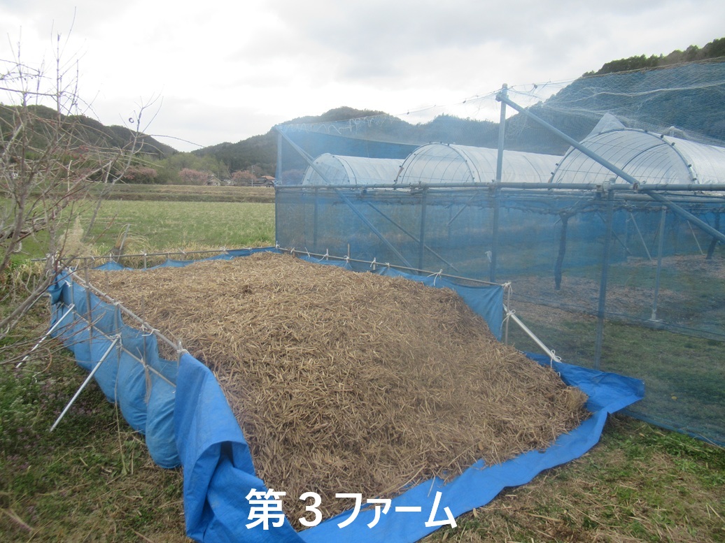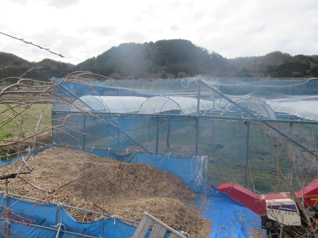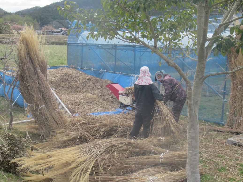 今日は茅の細断をしました。朝7時半にリース会社からマルチカッターを借り、8時から3人で作業を始めました。株元約20㎝の茅束を小束に分けてカッターの投入口に入れると約6㎝に細断されます。200束強の数がありましたが休むことなく作業をして3時間で終わりました。リース料金は約1万3千円でしたが出来た茅量からすれば安いものです。茅は今月中旬落葉とともにぶどう園に入れます。