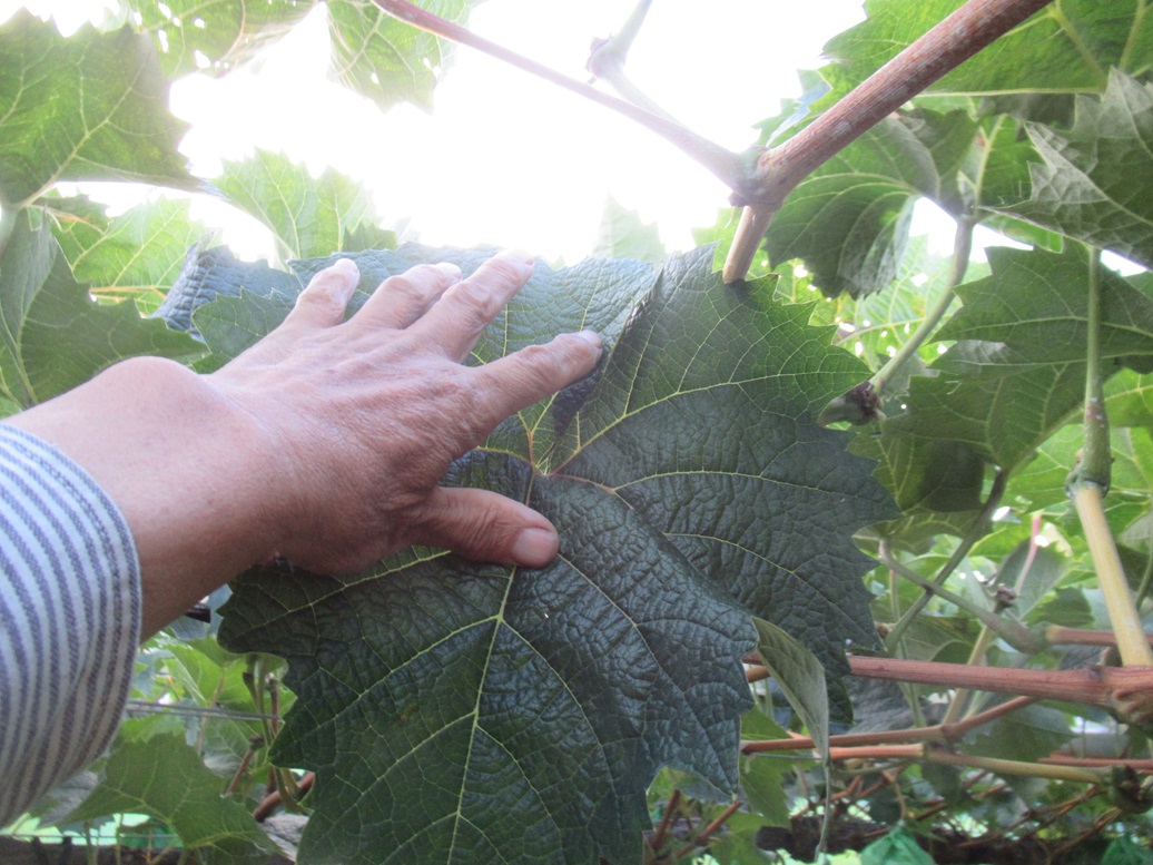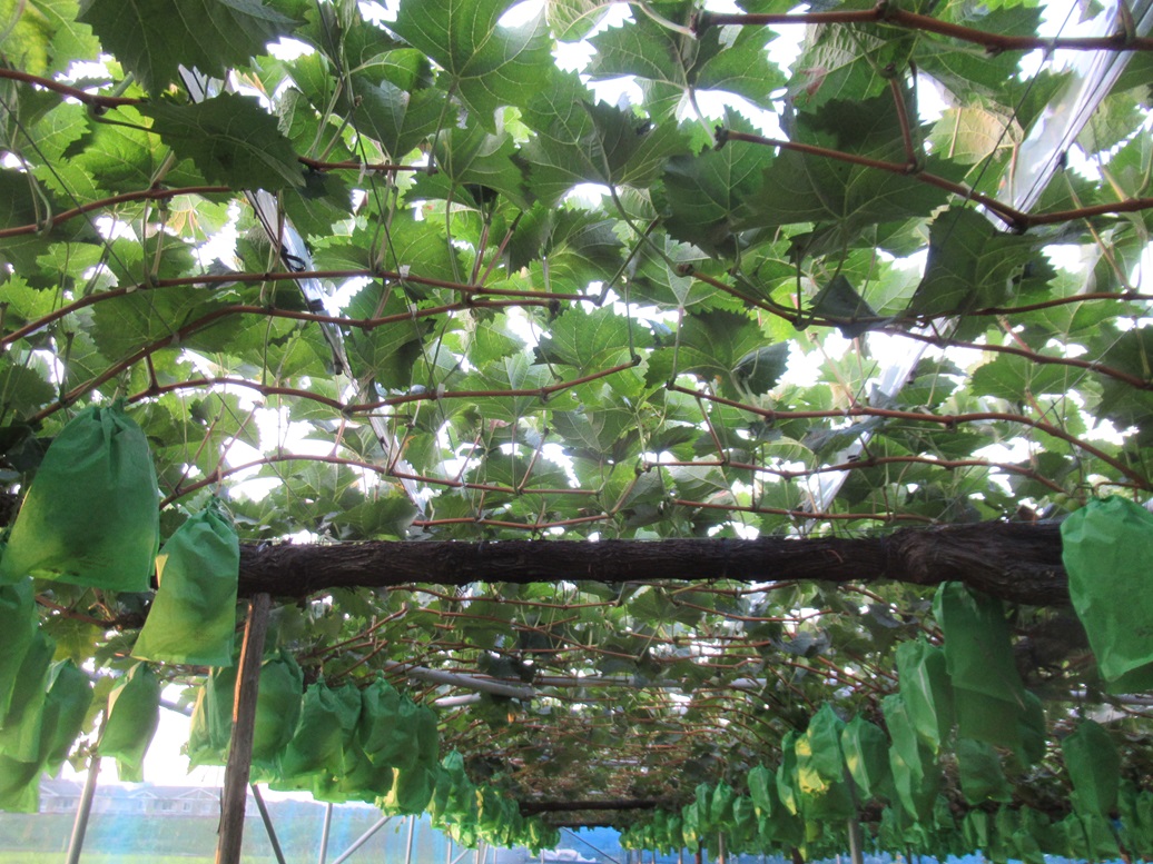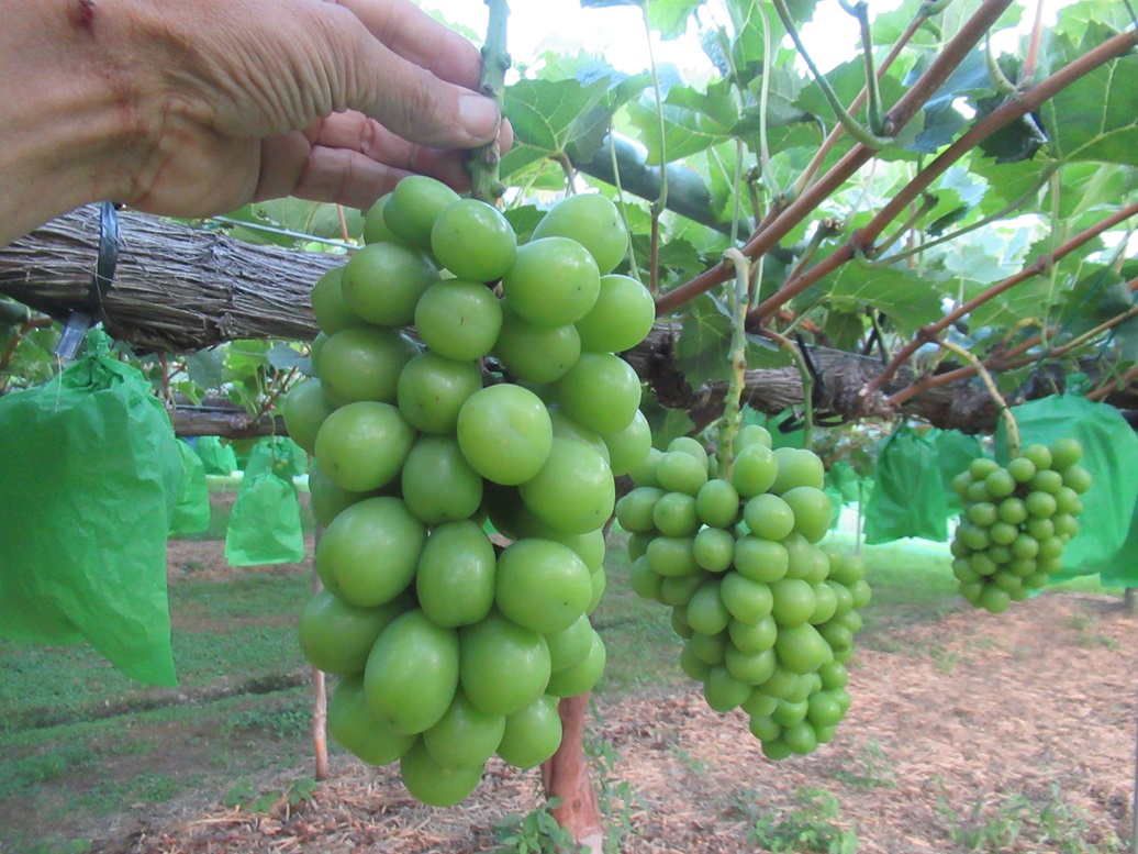晴美ファームのシャインマスカットの現状です。晴美ファームでは普通目にするシャインより大きい約800~900gの房を目標にしています。しかし、整形時やその後の気候による玉太りで大きさは毎年違ってきます。今年は肥大期に適度な雨があったためか全体に大房になっています。たぶん、最終的には1kgを超える房も出てくると思います。あまり大房になると樹への負担が大きくなり来年の生育に悪影響がでないか心配ですが、今年は葉の大きくしっかりしているのでなんとかなると考えています。