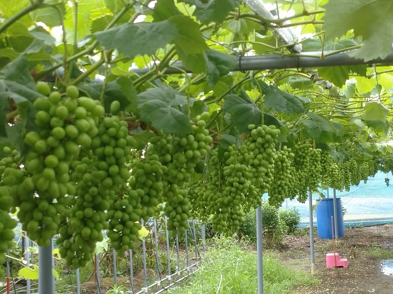 そういう訳からか近くでは極端な大房のシャインづくりをしている農家があります。一房1kg以上を狙っているようで車数は16から多い房では20以上もあります。さらにほとんどの枝に2房をつけています。当然ながら粒は標準のシャインよりは小さくなりますがそれは覚悟の上です。昨年は糖度の乗りが少し悪かったですが店では目立ちそれなりに売れたようです。将来的に樹にどんな影響が出るか分かりませんが、特色あるぶどうづくりという点では面白い作り方だと思います。