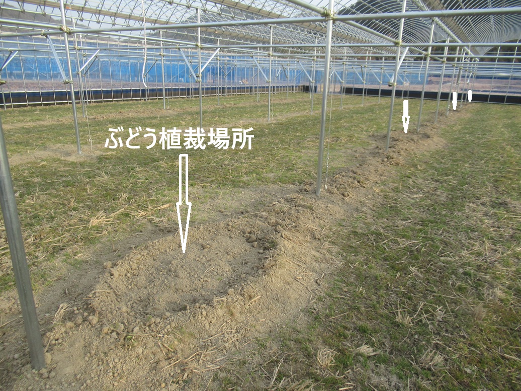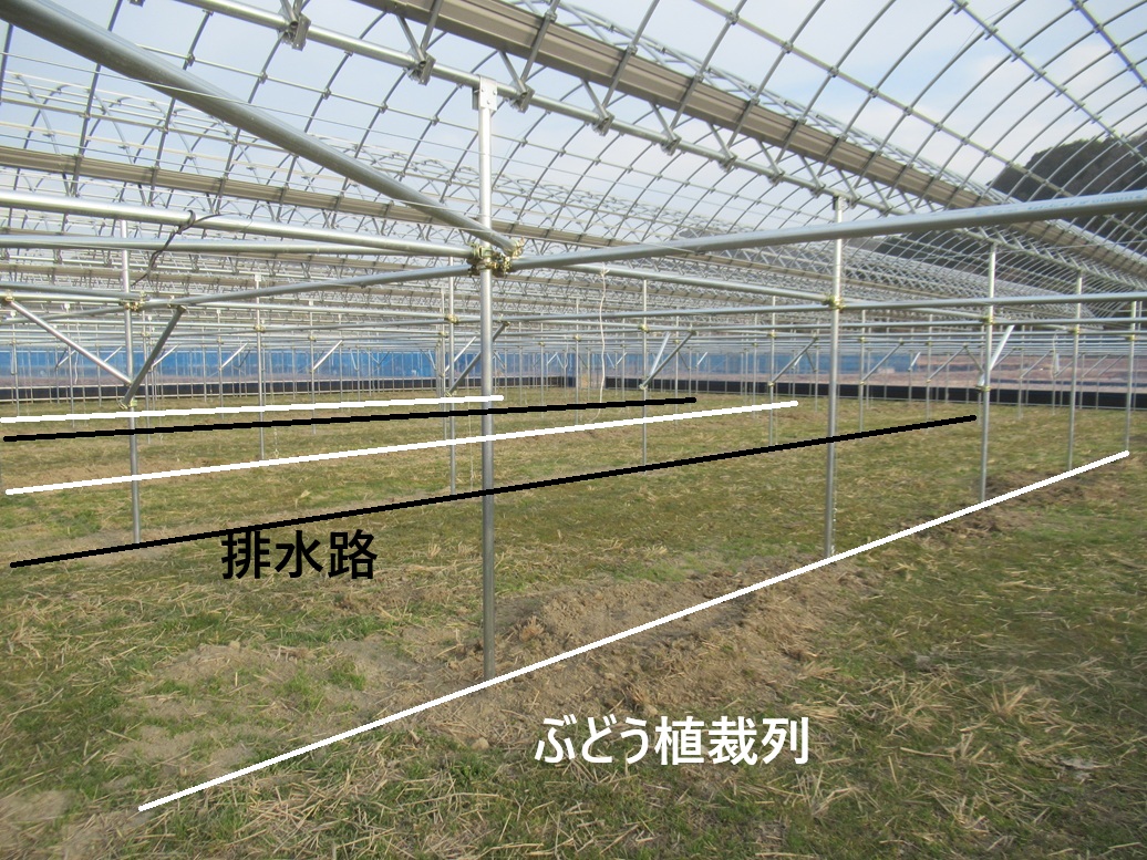 新ハウスのぶどう苗木の植裁準備ができました。せっかく出来たハウスですが今年は苗木育成のためビニール被覆はしません。そうなると大雨のときにはハウス内に雨水が溜まって苗木の生育に良くありません。そこで一般的にはハウス内には排水路はいらないのですが今年のためだけに簡単な排水路を作ることにしました。排水路を掘ったために出た土はぶどうの植裁場所の嵩上げに使いました。これでハウス内に緩やかな傾斜ができ水はけも良くなるハズです。