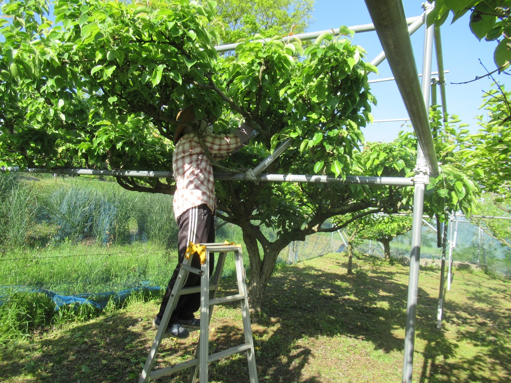 梨「幸水」の摘果をしています。この時期は私はぶどうを、パートナーは桃や梨の仕事をしています。「幸水」は花が多く、放っていると大量の実がなって摘果に苦戦します。今まさにその状態です。剪定のときやつぼみのタイミングで梨農家さんはなにか良い工夫をされているのではないかと思うので、教えて頂きたいです。昨日から、いっぱい付いている実をハサミで摘果しています。もう少し早い時期なら爪で切れたかもしれません。それだけでも時間短縮できそうです。