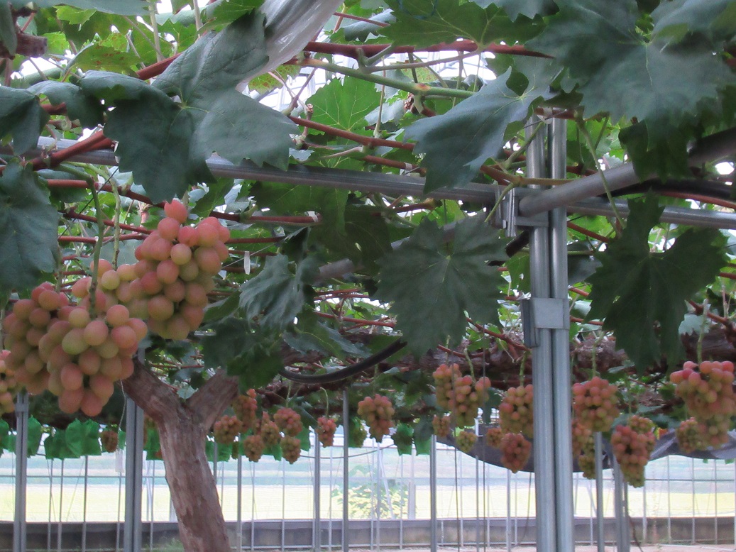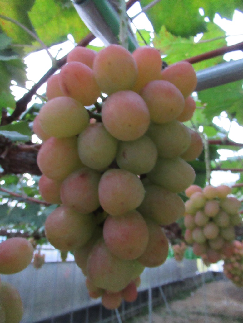朝晩が少しずつ涼しくなり遅れていた赤系ぶどう赤嶺が全体的に色づき始めました。生育が強く葉が過繁茂になり房に光がほとんど当たっていなかったのが色がつかなかった原因だと思います。9月の下中旬に房の周りの葉を切り取り房に光が当たるようにしてから少しずつ色づき始め10月になり何とか赤くなてきたという感じです。他の赤系品種はだいぶん収穫が終わってきたのでこれからは赤嶺が3色セットをうめてくれます。