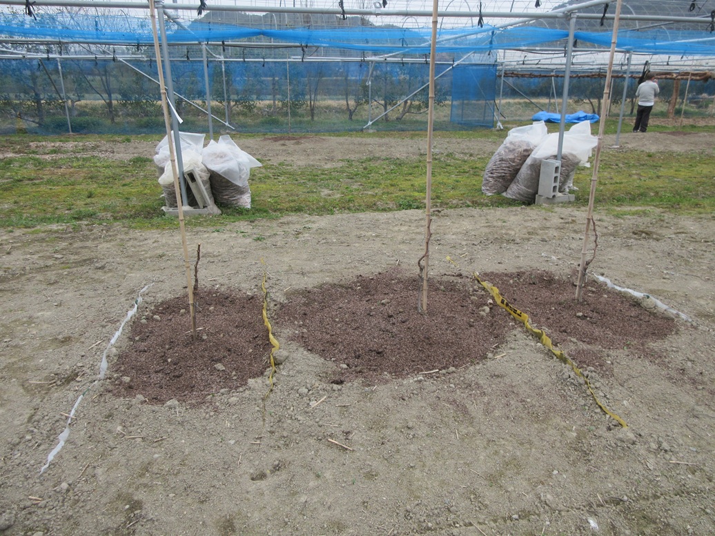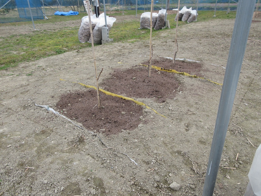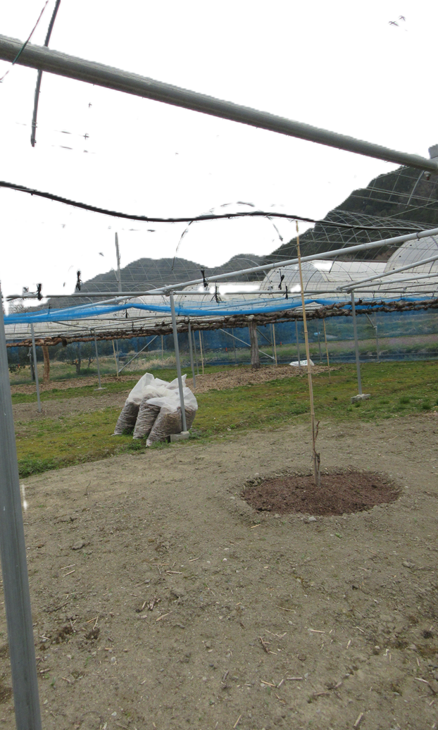 このタイミングでピオーネの苗を植えました。今、晴美ファームでは、9本のピオーネがあります。(その中の2本は半分ほどのサイズです。)ここ2年ほど、枝の先から枯れてブドウの房が黒くなるという症状が2か所ほど出ているのでので、まだまだ木はもつと思いますが、美味しいピオーネは外せないので、更新のため植えることにしました。3本並べて植えているのは、両端の2本を別の園に植える計画ですが、今場所が空かないので1年の養殖をして、掘り出します。肥料袋できれいに3本を分けているのは、根が伸びて、となりの木と交わらないよう育てるためです。