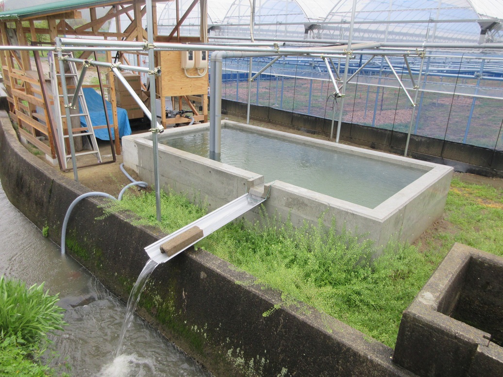 自動潅水になると水がたくさん要ります。そこで、かなり前、新ハウスの骨組みが出来た頃に水の確保についていろいろ考えていました。まず一つ目は井戸を掘る。二つ目は貯水槽を作ってハウスのビニールに降った雨を全部集めて貯水槽に貯めるです。結局は二つとも、手作りですが、なんとか完成させました。2年はかかったと思いますが。やっとこさハウスのといからのパイプも繋がり、昨日大雨が降りました。夕方行ってみると、上部まで満々と水が貯まり、自分が作った水の逃がし口から用水へ余った水がどうどうと流れているではありませんか。やっとできました。この水でぶどうの木にたっぷり水をやることができます。