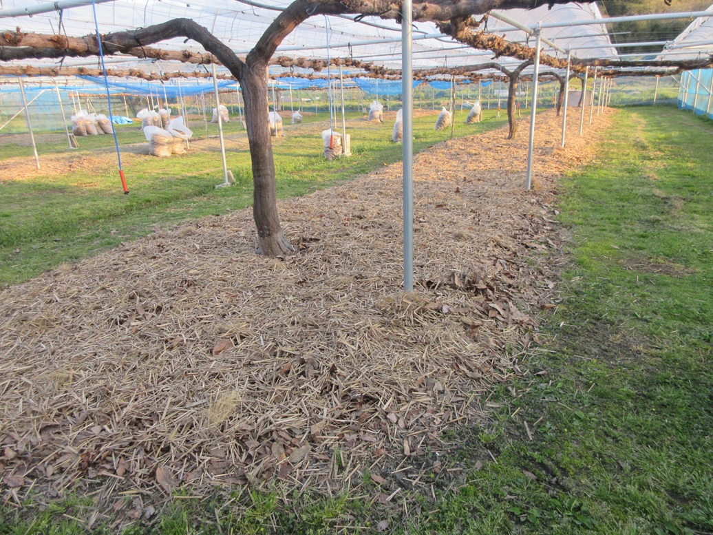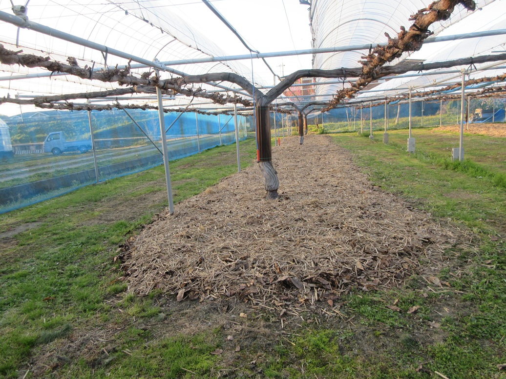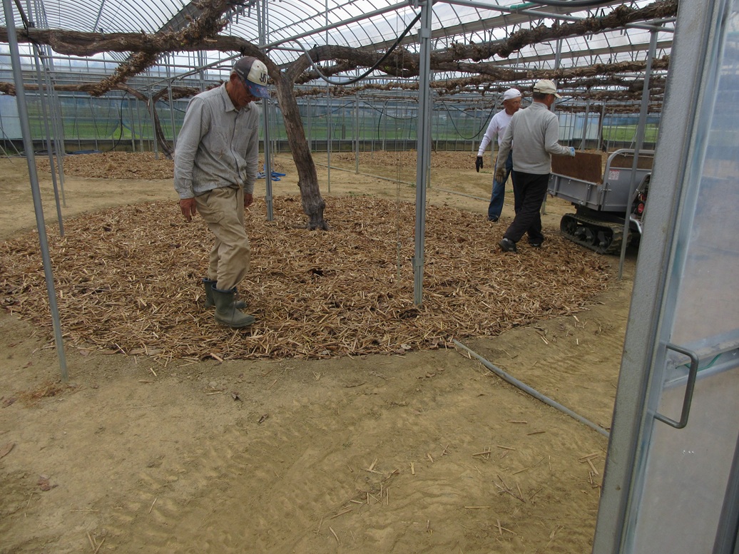 ぶどうの作業の中で一番えらい仕事の一つ‼ 落ち葉・茅置きが終わりました。雨の前にしようと思っていたので、8日9日の作業でした。まず、重いのが雨を含んで重なっている落ち葉。それをフォークで刺してクローラー運搬車に載せるのが大変です。さらに、株元に平均に落ち葉をならべて足で踏み込むのも大変です。1日目は晴美ファーム第3ファームを12時30分になんとか一応終わりました。2日目は晴美ファーム第1ファームを12時に終わりました。午前のその仕事でもうヘロヘロでした。